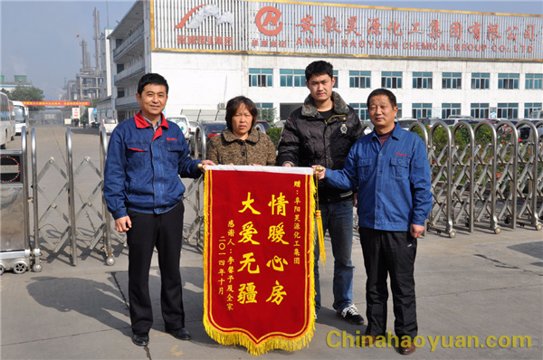 11月6日上午,阜陽市潁州區(qū)辦事處沿河村前小莊村民李馨予一家人帶著錦旗來到昊源集團,向伸出援助之手的企業(yè)表示感謝。