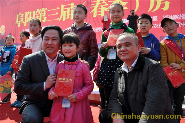 《阜陽(yáng)日?qǐng)?bào)》社社長(zhǎng)張洪、昊源公司黨委副書記李繼忠與獲獎(jiǎng)小記者合影