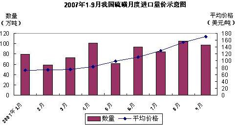 中國(guó)海關(guān)統(tǒng)計(jì)數(shù)據(jù)顯示, 2007 年前 3 季度,我國(guó)共進(jìn)口硫磺 753.6 萬噸,價(jià)值 8.4 億美元,比 2006 年同期分別增長(zhǎng) 16% 和 56.4% 。